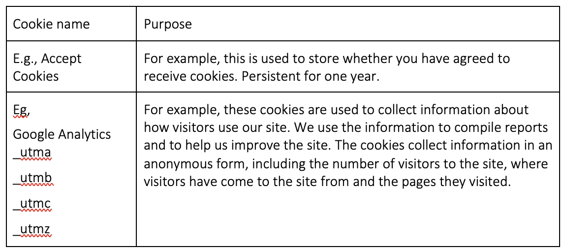 In compliance with EU legislation, the following table lists the use of cookies on this website: